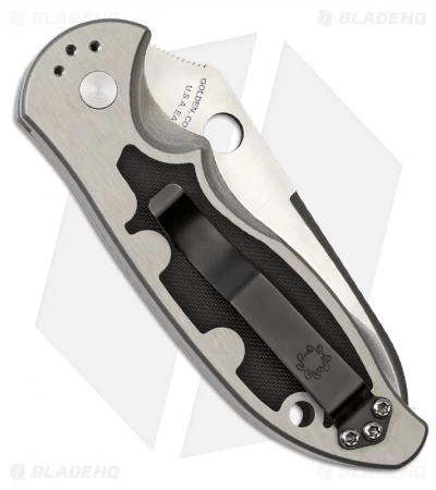 The Embassy is a great quality automatic knife from Spyderco that you will be sure to cherish. It boasts a grey anodized aluminum handle with G-10 inserts (front and back) for maximum gripping power. The CPM S30V blade is satin finished (plain). The plunger lock push button deploys the blade and the action is fast and lock-up solid. The Embassy also features a sliding safety and reversible pocket clip, tip up.
