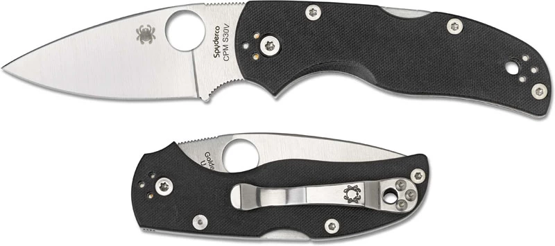 The illustrated Spyderco Knife is the Spyderco Native 5 Knife that features a 3″ spear point blade made of CPM S30V stainless steel. The blade of this Spyderco knife has a flat grind, a notched choil and thumb rest for secure grip, and the Spyderco hole for ambidextrous one hand opening. The contoured black G10 handle, 4″ closed, has a solid stainless steel backspacer for strength, a lockback and a lanyard hole. A side to side and end to end reversible metal pocket clip is included with this Spyderco Knife. The Spyderco Native 5 Knife has an overall length of 6 7/8″ when open, and it weighs 3.7 ounces.