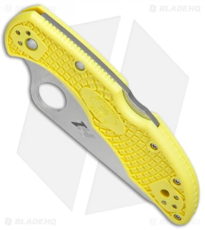 This Salt 2 knife has a yellow FRN handle and a rustproof H-1 steel blade with a plain cutting edge.