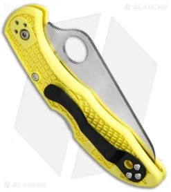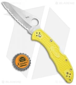 This Salt 2 knife has a yellow FRN handle and a rustproof H-1* steel blade with a fully serrated cutting edge.