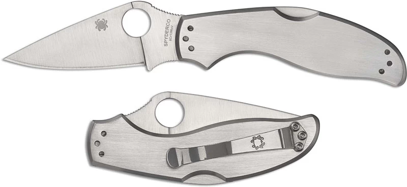 The C261P Spyderco UpTern Lock Back is a welcome addition to the Spyderco Value Folder lineup that features a 2.84 inch drop point blade made of 8Cr13MoV stainless steel, .104 inches thick, with a full flat grind, notched thumb ramp and choil for secure grip, and the Spyderco hole for ambidextrous one hand opening. The slim profile stainless steel handle (perfect for engraving), 3.80 inches closed, has ergonomic contouring for comfort, sturdy lock back, and a 4 position steel pocket clip. The Spyderco UpTern Lock Back Knife has an overall open length of 6.58 inches and it weighs 3.7 ounces. Made in China.