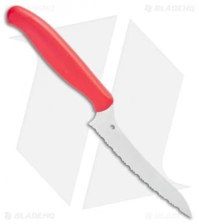 This Spyderco Z-Cut has a red handle and a pointed blade with a serrated edge.